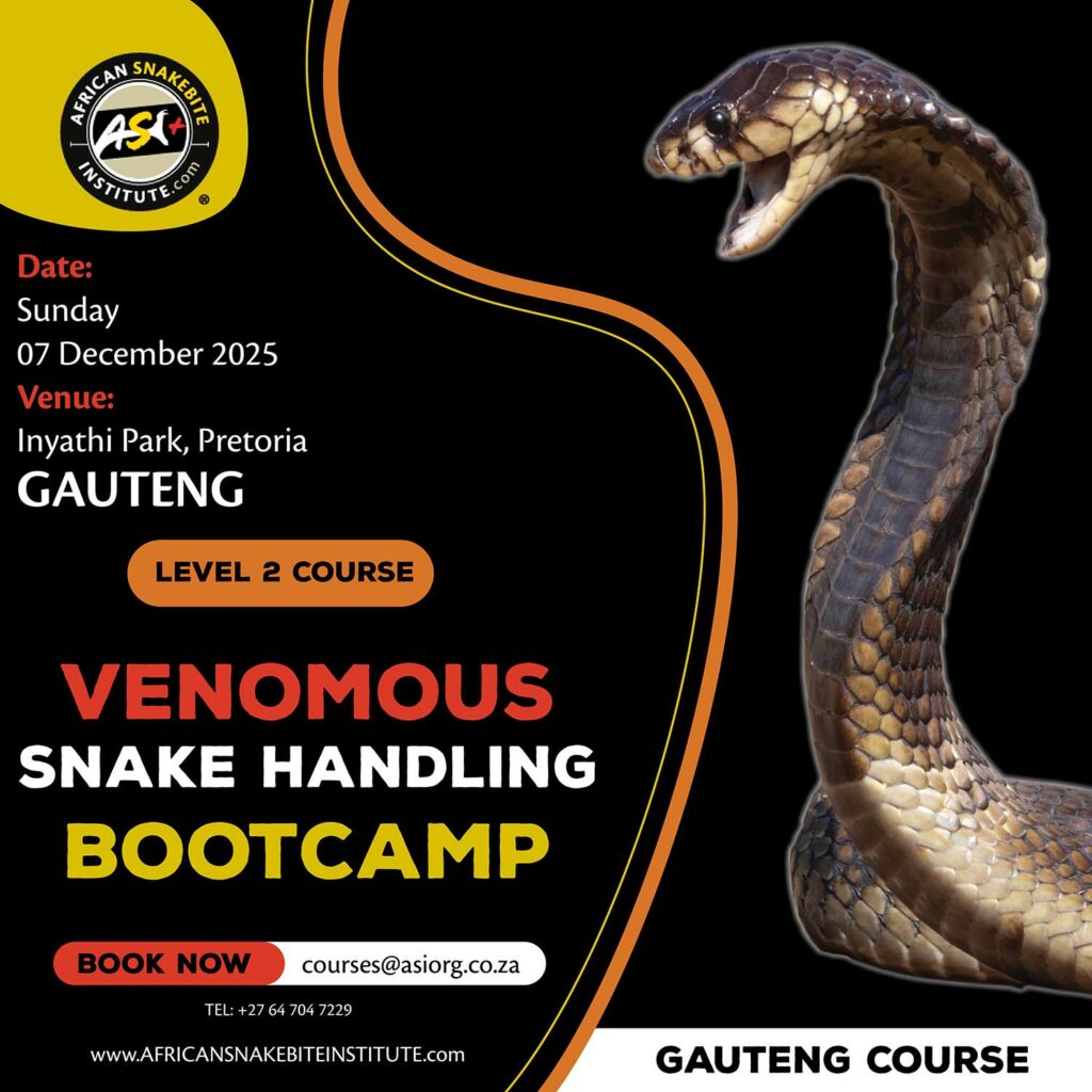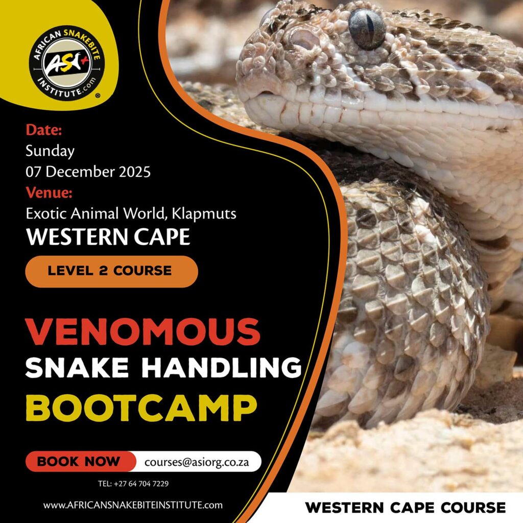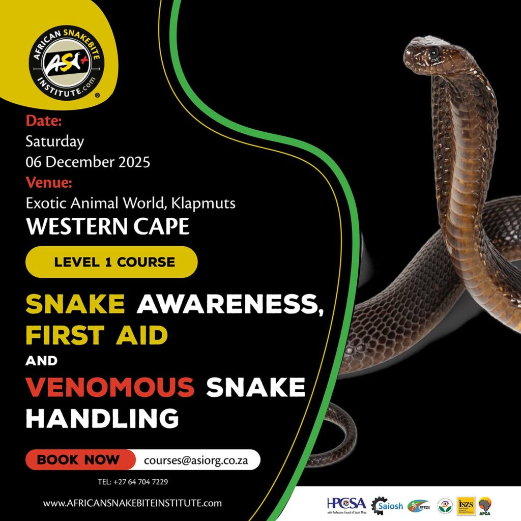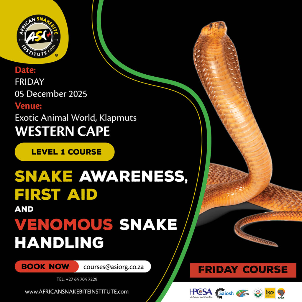 This course covers the basics of snake awareness in southern Africa, first aid for snakebite, behavior, anatomy, venom, and myths. Spiders and scorpions are also covered but not comprehensively.