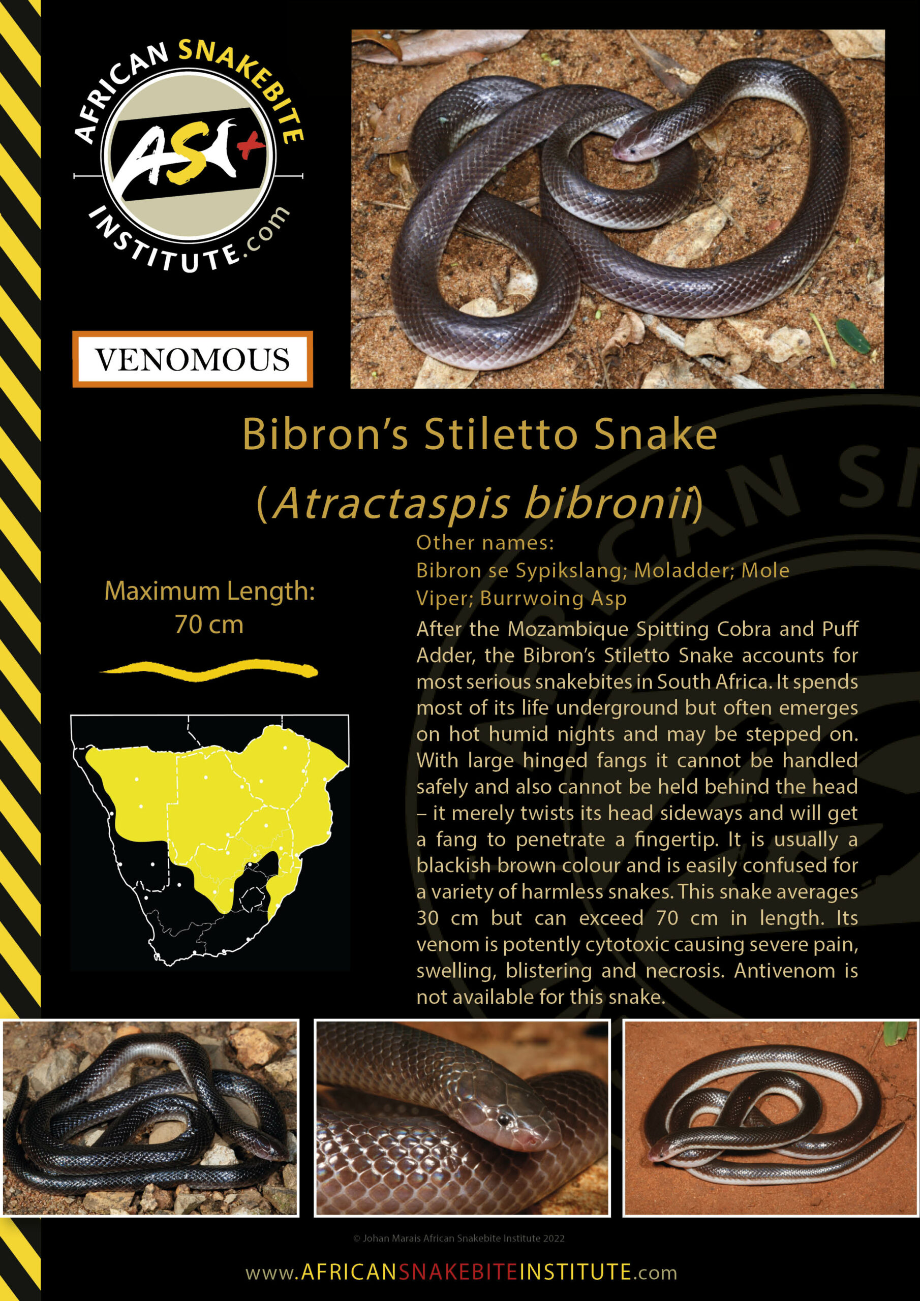 The Stiletto Snake or Sypikslang (Atractaspis bibronii), is a small, highly venomous snake that accounts for numerous snakebites during the summer months in Southern Africa. Previously known as a Mole Adder or Moladder, these dark snakes are often confused with harmless-looking snakes, and people tend to pick them up with their hands – the consequences of such a mistake can be very painful.