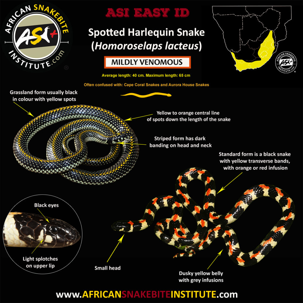 It’s easy to confuse an Aurora House Snake with the Spotted Harlequin Snake.