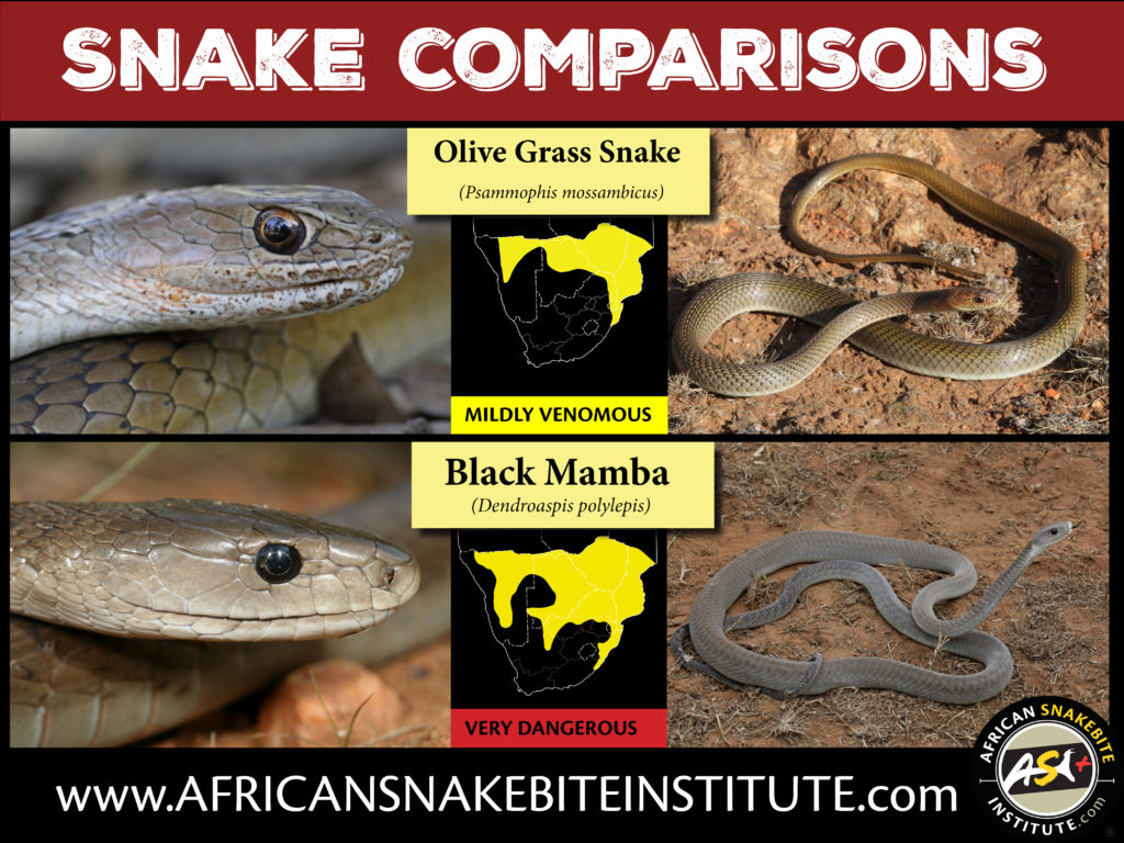 It’s easy to confuse an Olive Grass Snake with a Black Mamba. The graphics below illustrate how to recognize the key differences between the two species.