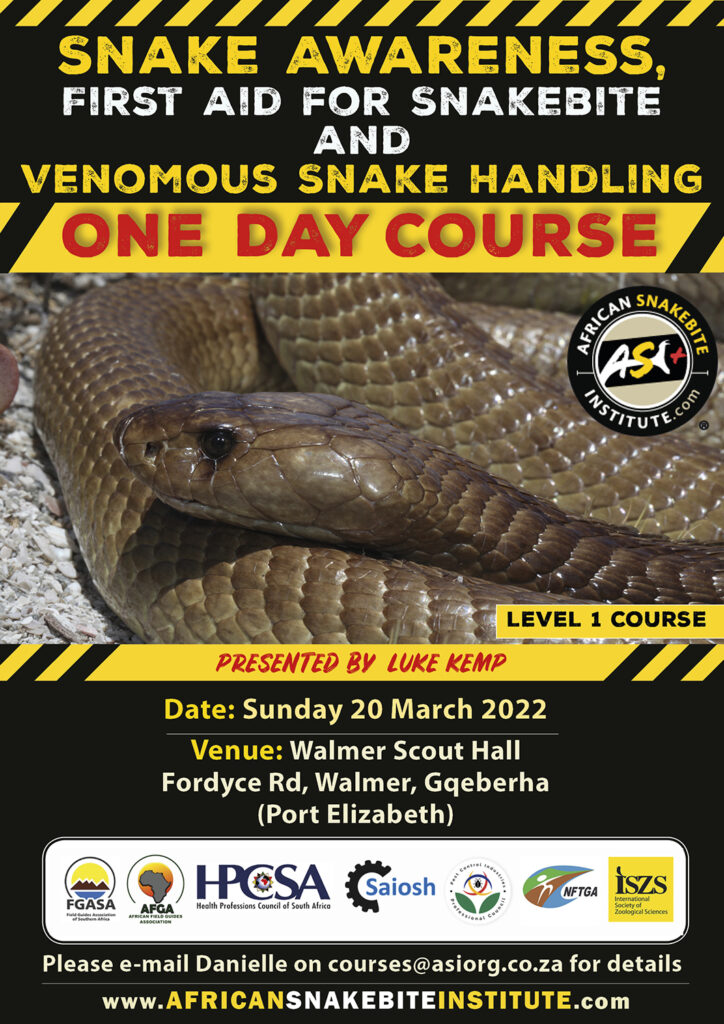 Each delegate will receive a course certificate, First Aid for Snakebite booklet, Weatherproof snake poster, as well as a full colour A3 Dangerous Snakes of Southern Africa poster.
