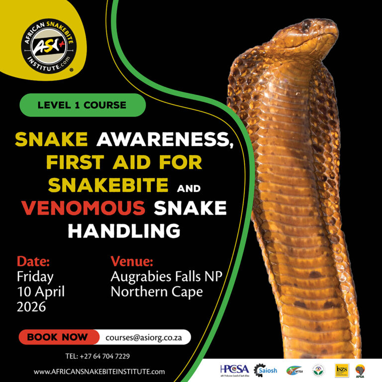 Each delegate will receive a course certificate, First Aid for Snakebite booklet, as well as a full colour A3 Dangerous Snakes of Southern Africa poster.