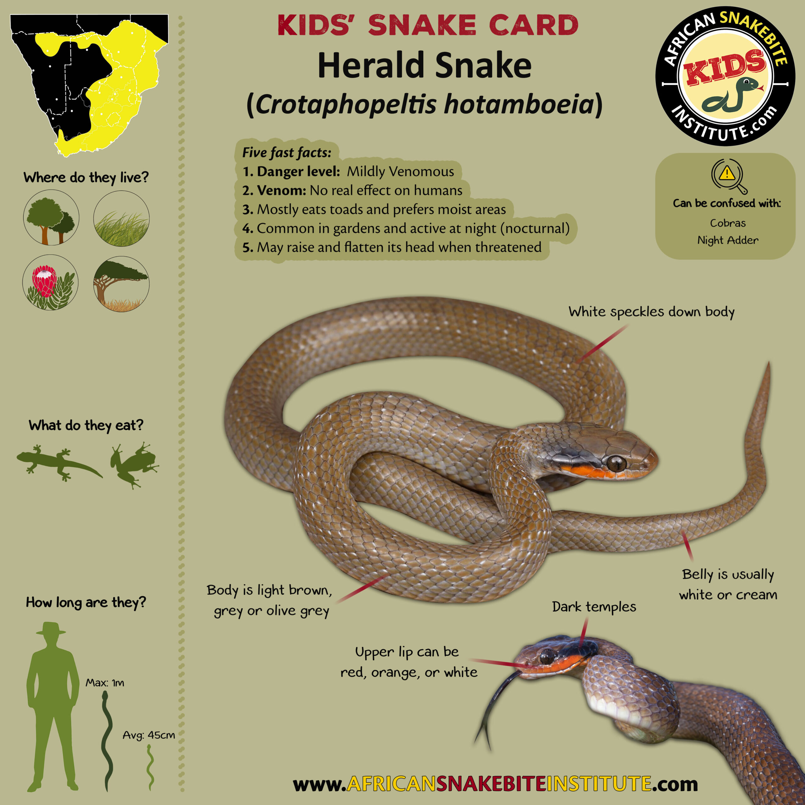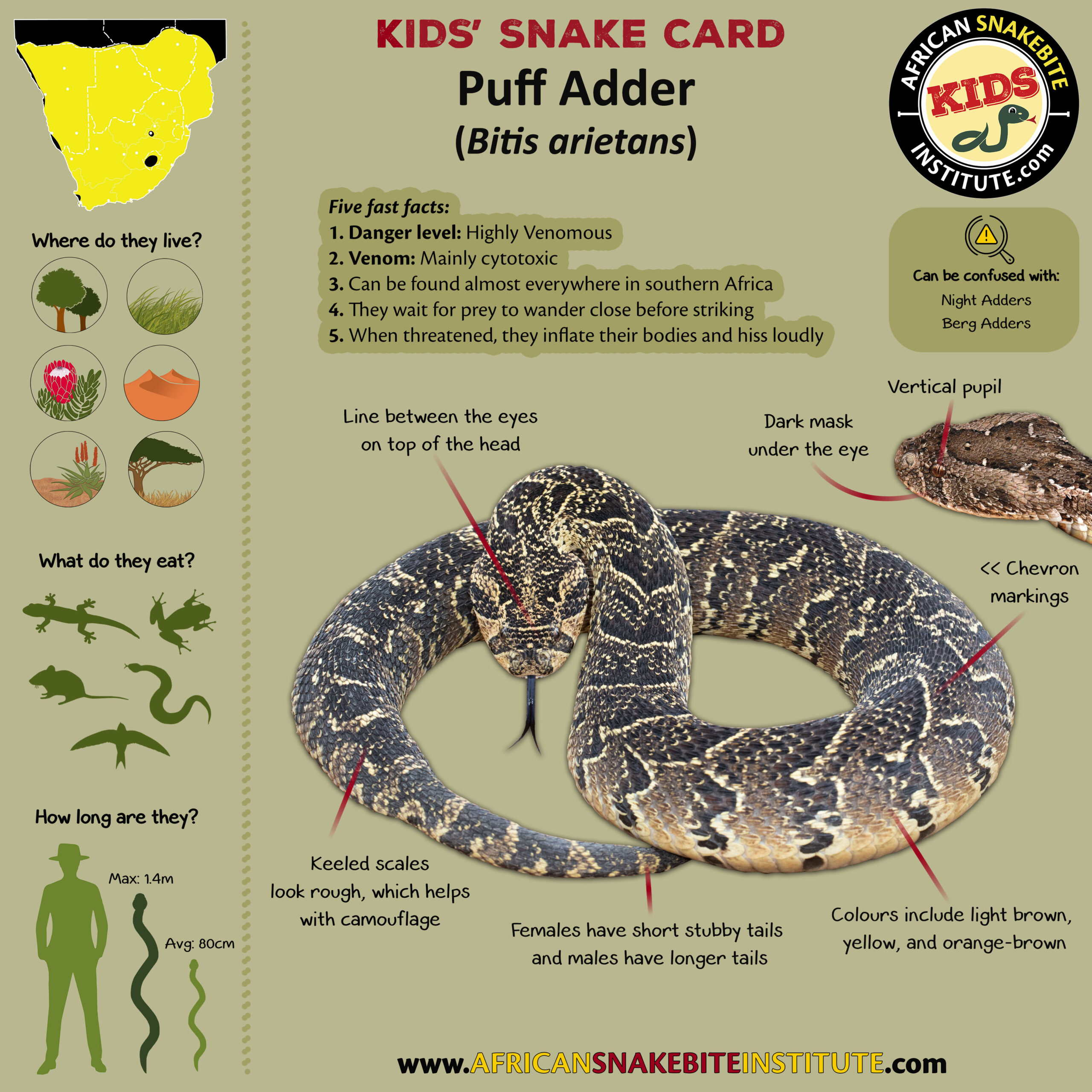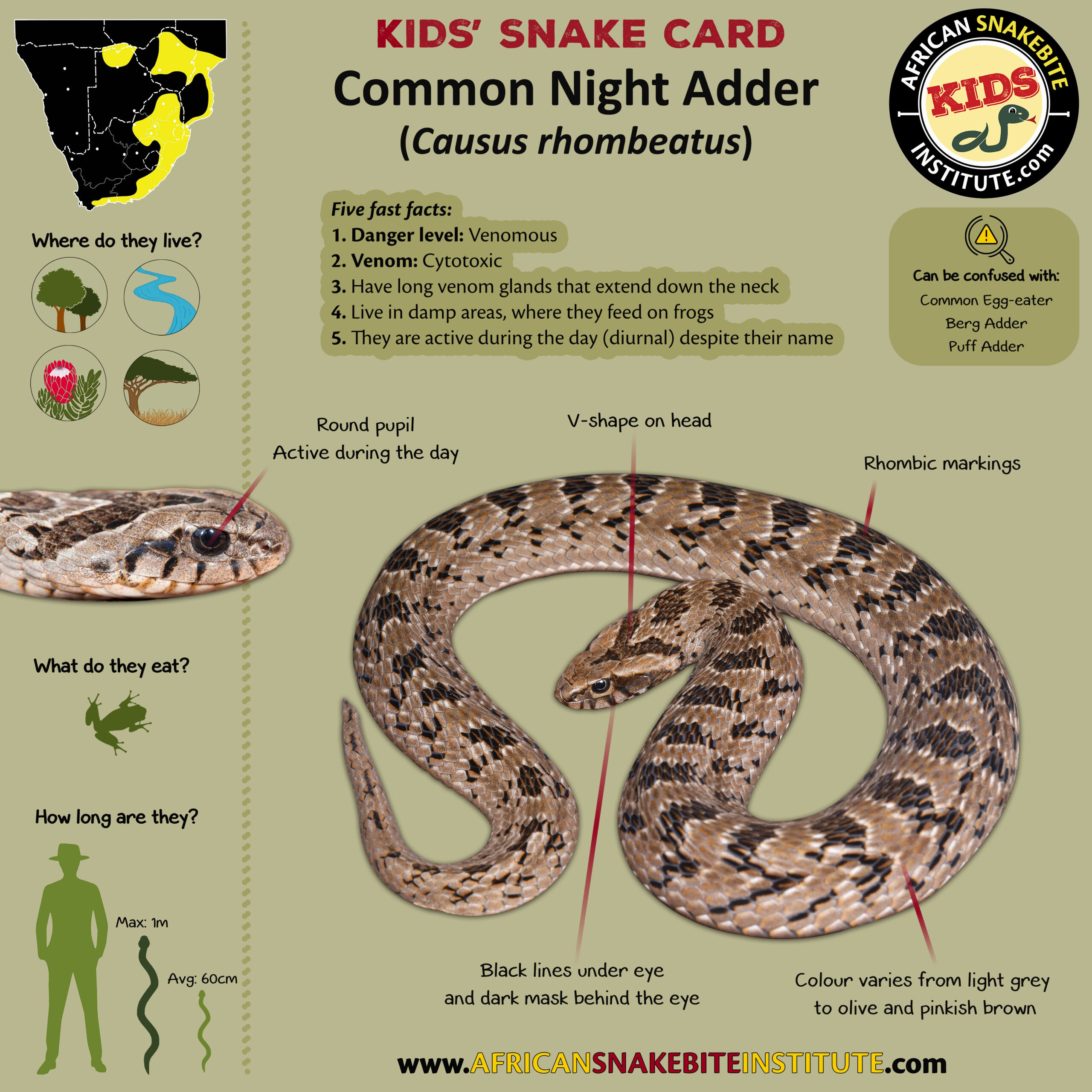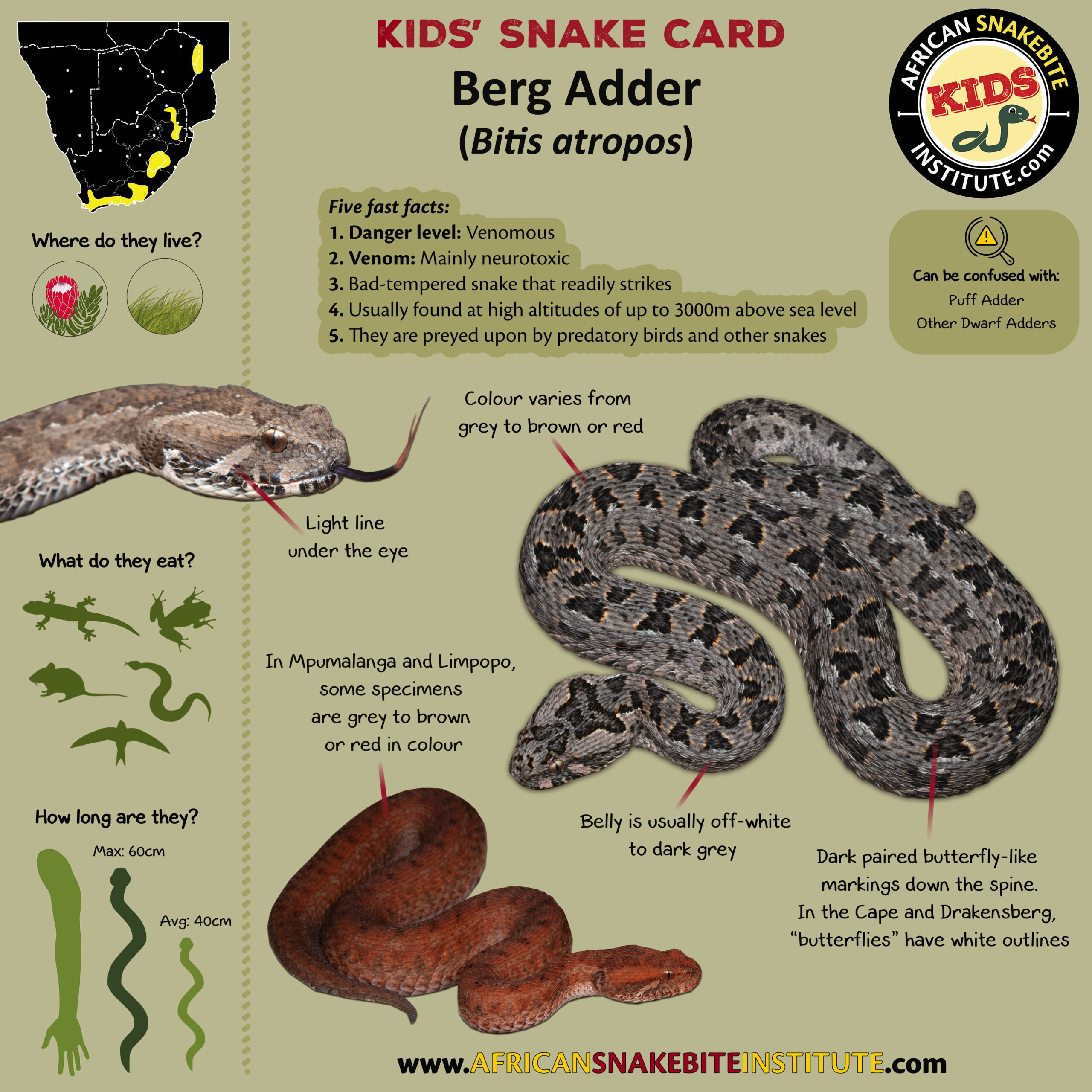 Our Kids’ Snake cards were developed for our online Kids’ Snake Awareness course – and were created to help children to see the key identification points for each species.