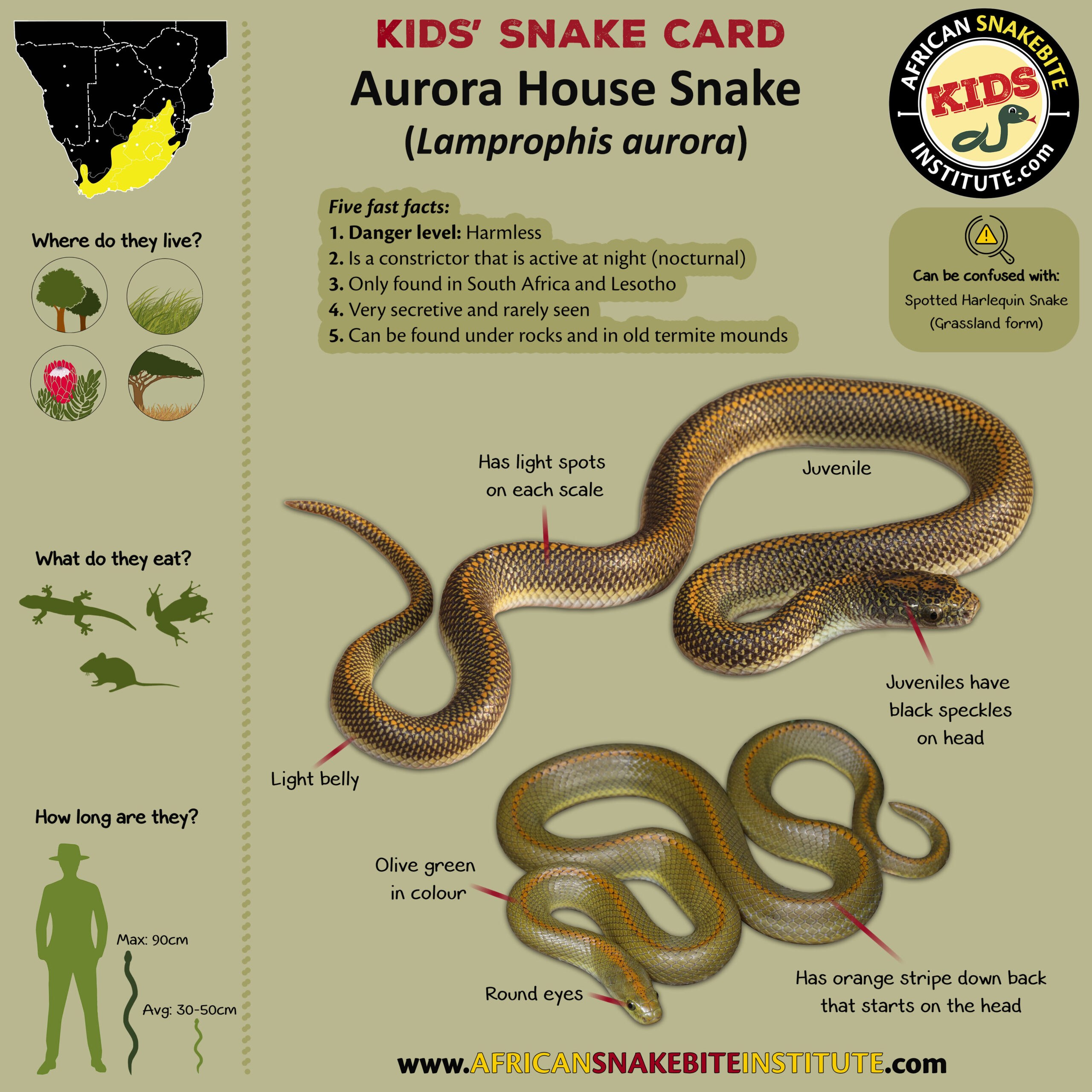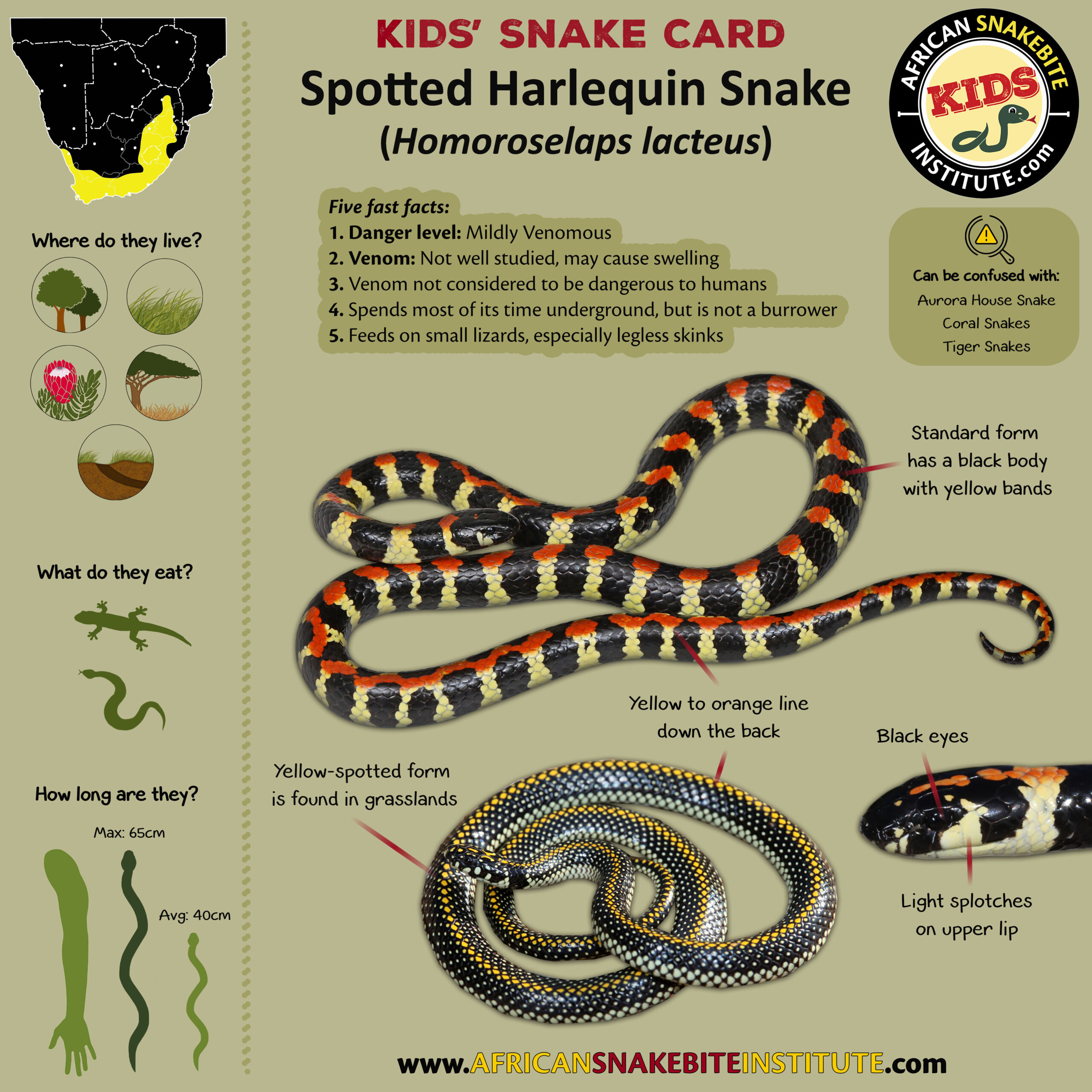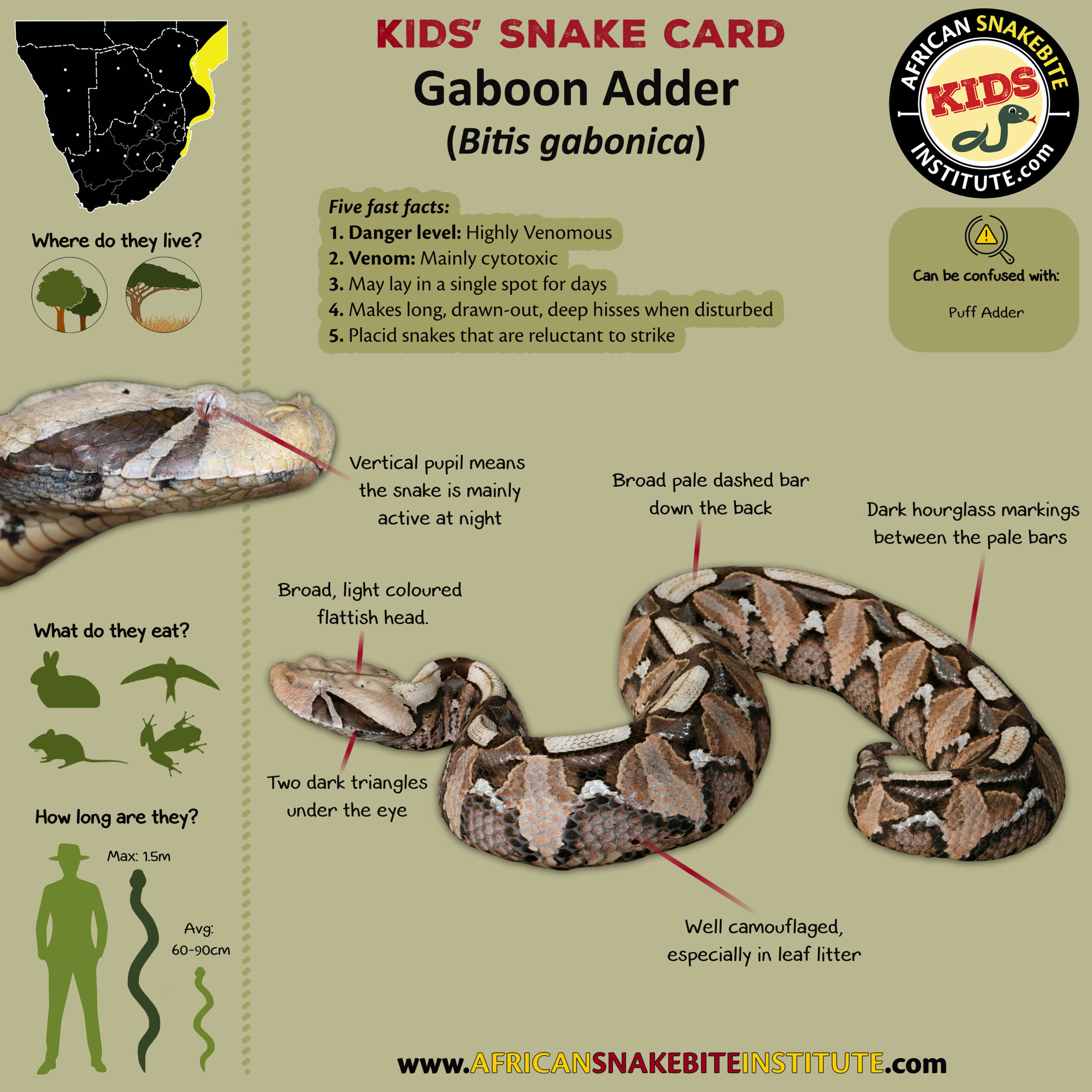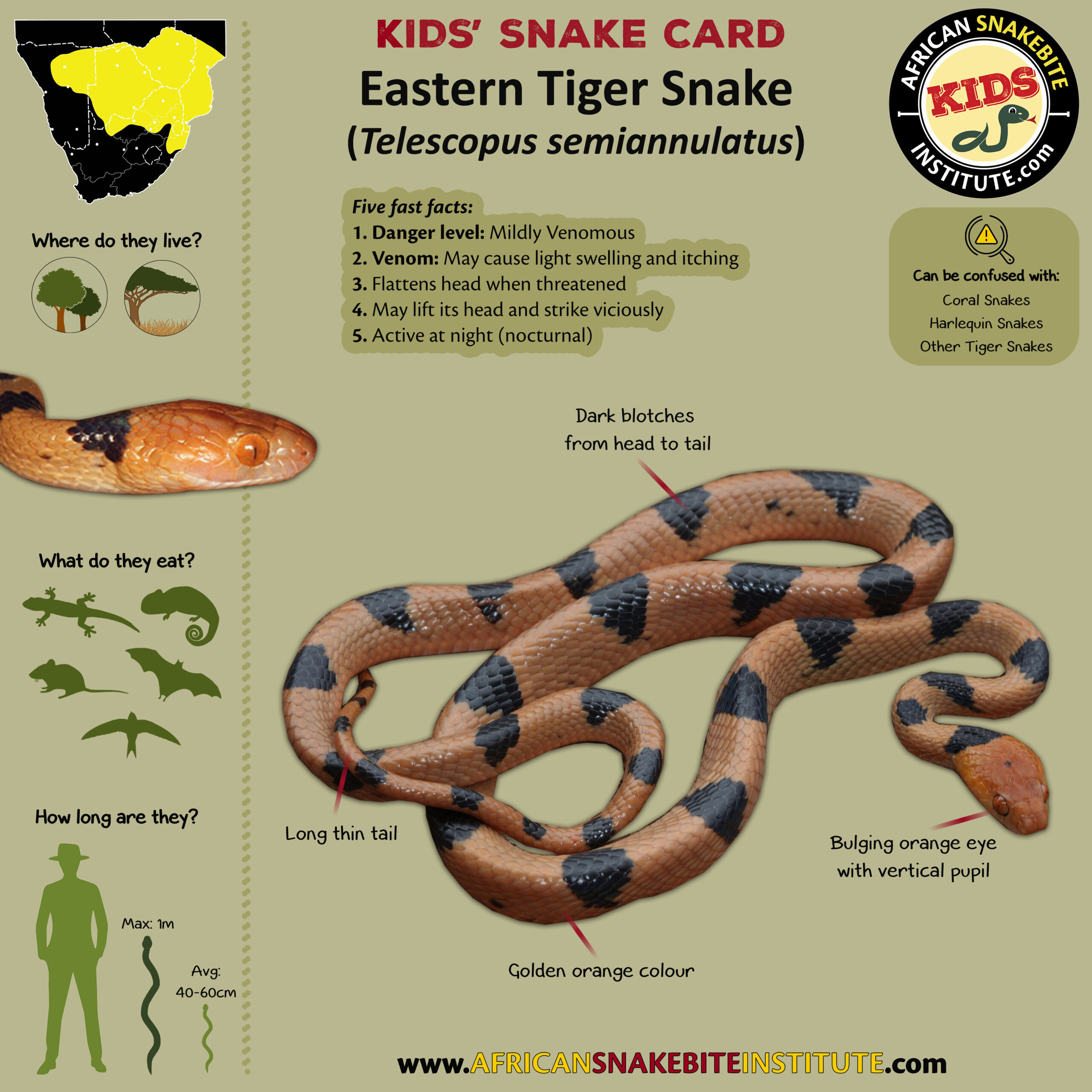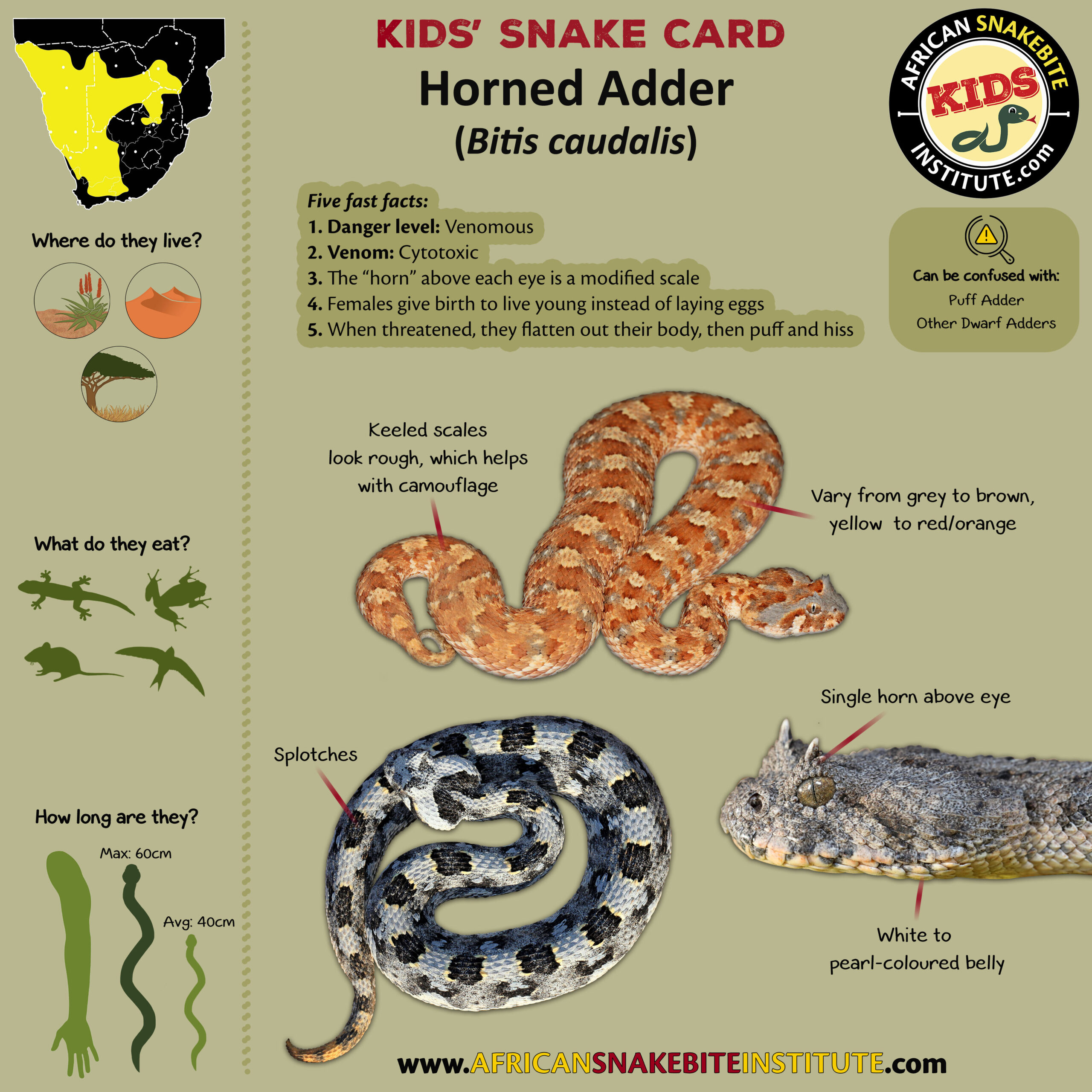 Our Kids’ Snake cards were developed for our online Kids’ Snake Awareness course – and were created to help children to see the key identification points for each species.