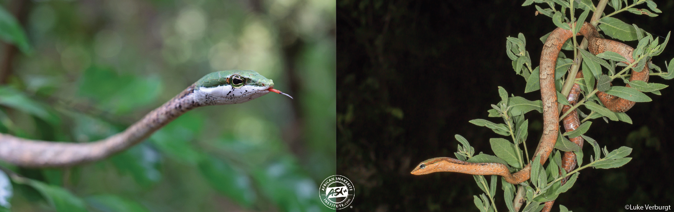 Description – Three species of Vine Snakes are known from East Africa. All are slender snakes, which resemble a branch or vine, in patterned shades of brown and grey. The head is bright green above with a pale lower jaw. The tongue is bright red and black-tipped. Recorded to reach up to 1.6 meters in length.