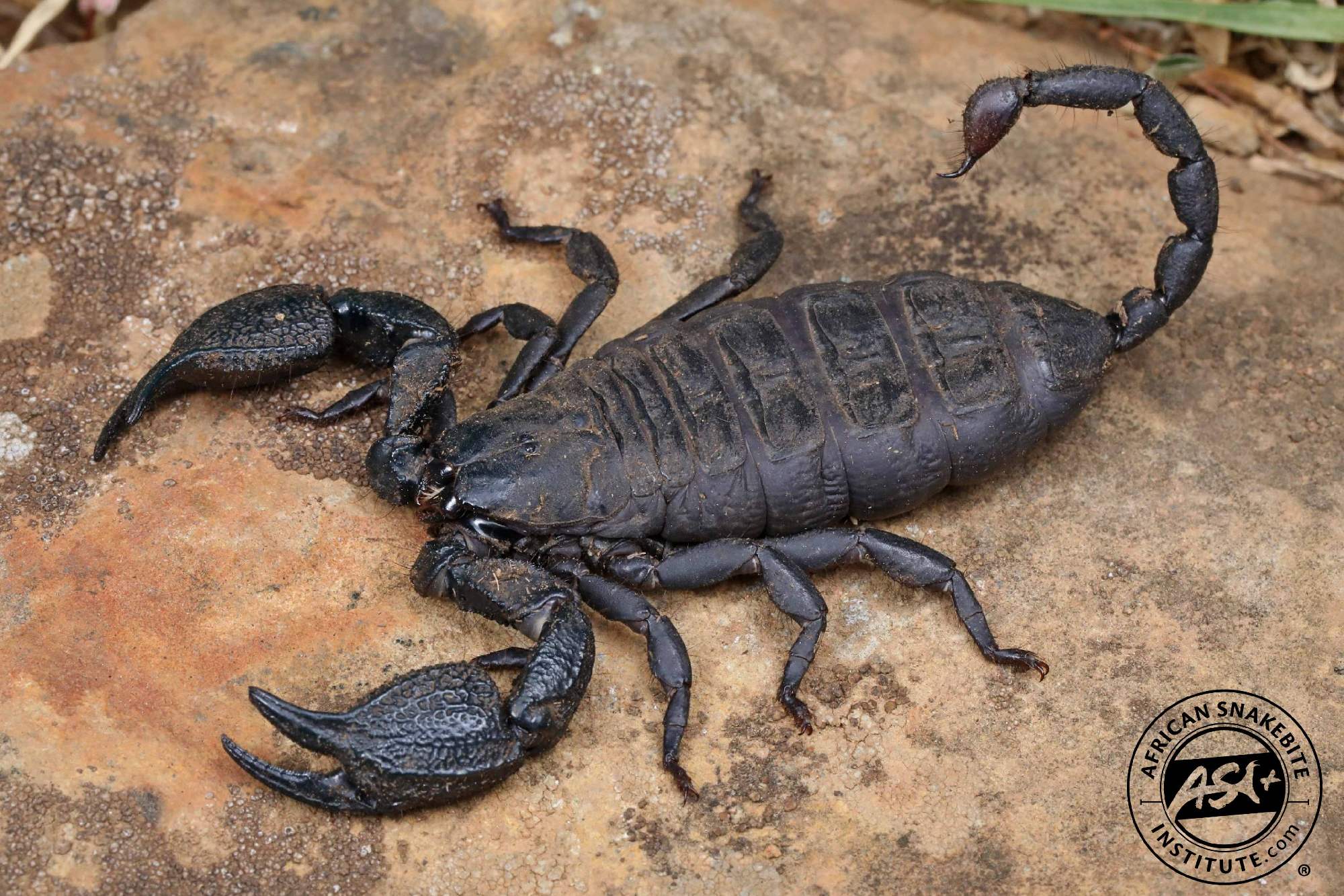A medium sized scorpion of around 9cm with the tail extended. This species is pitch black but may have a brown appearance due to mud or dirt. It is a burrowing species with large pincers and a small tail.