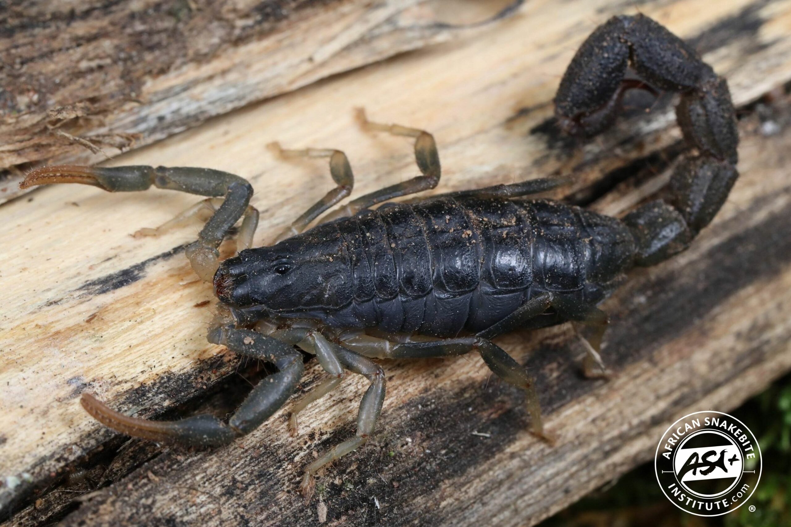 A small scorpion under 5 cm with the tail extended. A black to dark blue/olive scorpion with light banded legs and pincer. The joints of the legs and tips of the pincers are usually light yellow to orange.